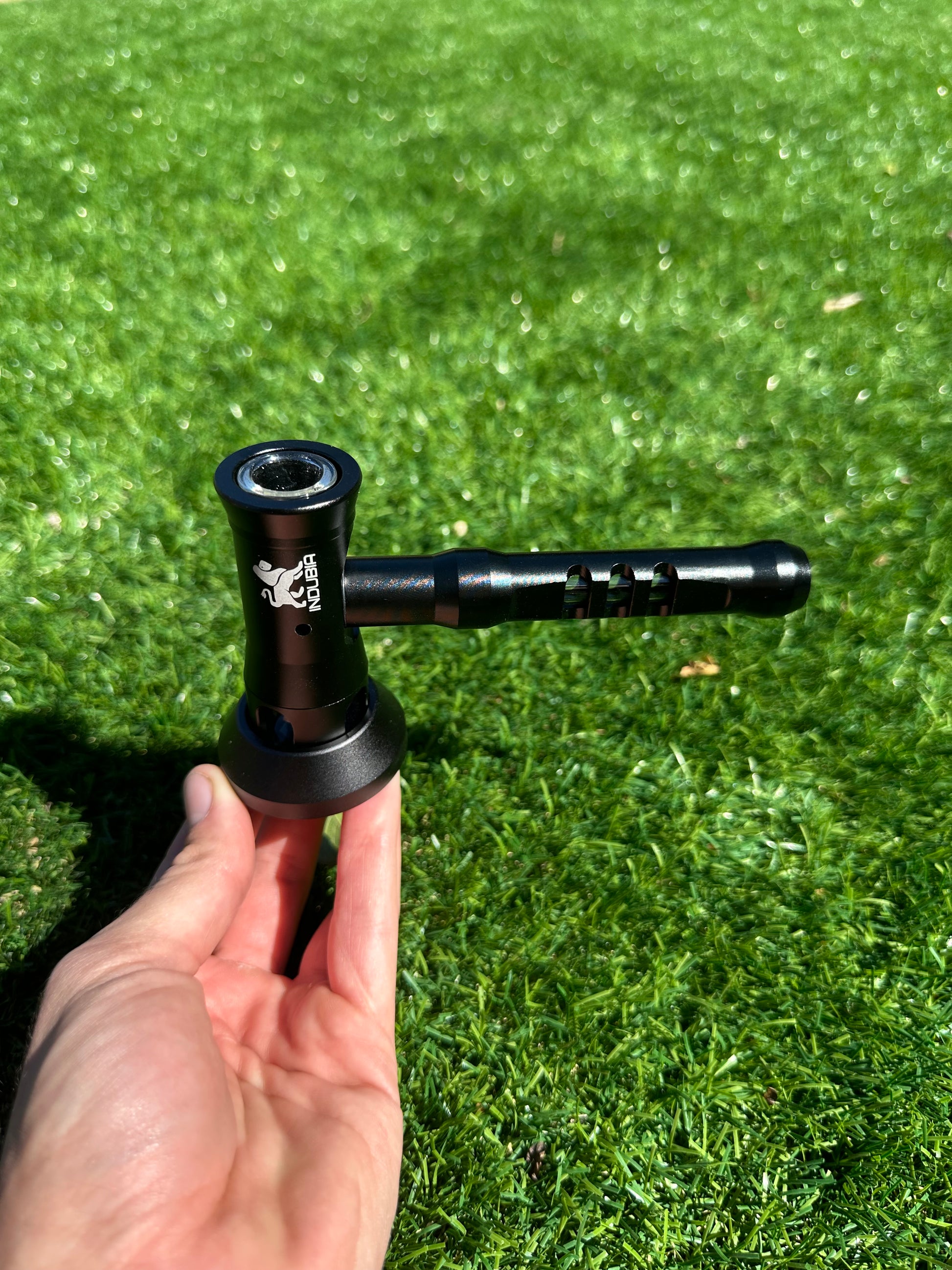 Behold the INDUBIA™ BUBBLER. A hybrid of a hand-pipe and a water pipe. This pipe features all glass on the inside, including a water reservoir, which you would fill with water or ice, giving you a cool and comforting hit. A stand is included to keep the BUBBLER up-right when not in use. The glass inside is protected by an Aircraft-grade aluminum frame, which is fitted with removable rubber gaskets to provide protection and shock absorption to the glass inside, providing the user with a high-quality glass pipe experience that isn't fragile. Elevate your smoking experience with INDUBIA™.
